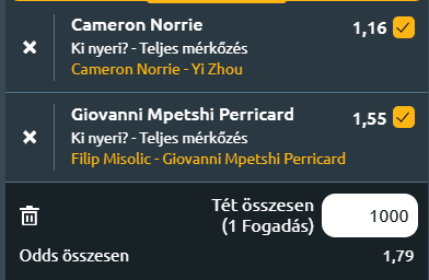 - C. Norrie – Y. Zhou: Cameron Norrie a top 30-as brit játékos, balkezes, és kiválóan variálja a tempót. Kemény pályán is képes dominálni, különösen a hosszabb labdamenetekben. Mentálisan a világ legjobbjai közé tartozik, igazi darálógép, aki soha nem adja fel! Yi Zhou hazai pályán játszik, de még nem rendelkezik komoly ATP-tapasztalattal, inkább a Challenger szintű tornákon szerepelt. Norrie egyértelmű esélyes, Zhou számára ez inkább tapasztalatszerzés lesz, mint valódi győzelmi lehetőség.