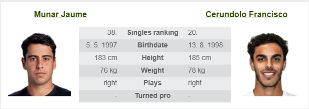 - Aktuális meccs elemzése. Munar már lejátszott három meccset idén, ami figyelmeztető jel, hogy két teljesen eltérő stílusú és fizikai testfelépítésű játékostól, Baeztől és Fritztől, is kikapott szabadtéri keményen, a United Cup-on, így talán nincs még topformájában. Utána ezen a tornán az első fordulóban megverte Altmaiert 2-0 arányban. Cerundolo alapvetően erőteljesebb, jobb játékos, mint Munar, különösen kemény borításon esélyesebb. De idén még nem játszott egyetlen hivatalos meccset sem, így nem tudni pontosan, mire számíthatunk tőle. Ha hozza a tőle elvárt játékot, akkor mindenképpen esélyesebb, de így az idény elején mindenképp szoros meccs várható!