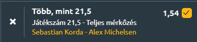 - Aktuális meccs elemzése: Michelsen nagyon jó formában van! Erőteljesen és mentálisan magas szinten játszik, legutóbb a rendkívül tehetséges Tien Learnert is megverte! Korda tavaly sokat volt sérült, emiatt kicsit vissza is csúszott a világranglistán, itt az első körben Vacherot-t két szettben verte, a második rundóban csak egy szettet játszott, mert Lehecka visszalépett. A sokrétűség miatt Korda az esélyesebb, de Michelsen ebben a formájában simán meg tudja verni, ha kijön neki a lépés, de minimum megszorítja majd! A bukik Korda-győzelmét várják, én azt mondom, szoros lesz, minimum 22 game várható és itt akár meglepetés is születhet!