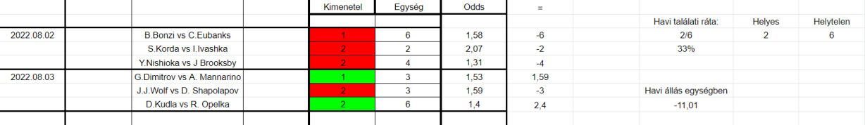 A tegnapi nap vegyes volt a tippek szempontjából, Opelka és Dimitrov hozta a kötelezőt, Shapolapov vizószont alul maradt. Nem kellett volna sok Denistől, de egy kicsit Wolf magasabb színvonalon játszott mint, azt én vártam. A hónap még hosszú nagyon, így állunk jelenleg: