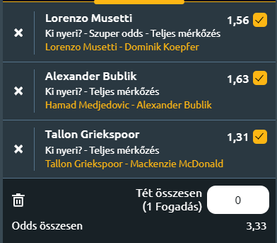 - L. Musetti - D. Koepfer: Musetti technikai fölénye, univerzalitása és mentális ereje összességében többet ér, mint Koepfer ütőereje. Az olasz sikerét várom.