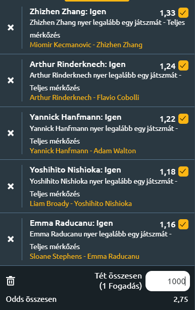 - Tegnap megint elment a szelvény, emiatt fokozódik az eredménykényszer. Brouwer kikapott nagyon szűken, de Fognini most hozta magát. Ma több a meccs, de próbálok biztosabbra menni. Négy olyan meccset választottam, ahol komolyabb esélyei vannak az egyik játékosnak és ezeknek a játékosoknak csak a szettgyőzelmét raktam be. Szóval a kockázat minimalizálása volt a cél. Persze vaskos meglepetések mindig vannak és lesznek, de bízzunk a legjobbakban. Jöhet a 4. alkalom és a háromszoros tét.
