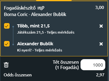- Mindkét játékos magas, erős és inkább az erőteniszt játssza. Nagyon jól szerválnak, erős tenyeresek jellemzik őket. Jó formában vannak mindketten, remekül teniszeztek az elmúlt héten. Bublik rengeteget fejlődött az elmúlt fél évben, kicsit talán komolyodott is. Auger Aliassime-ot verte az elődöntőben. Coric tehetséges volt mindig, de egy súlyos sérülés akadályozta karrierjét, amiből tavalyra látszott visszatérni rendesen. Coric talán univerzálisabb játékos, nem annyira a tipikus, magas erőteniszező, mint Bublik. Azt gondolom, hogy a kazah ha jó formában van meg tudja verni a horvátot (Auger Aliassime jobb teniszező, mint Coric), de mindenképpen szoros meccset várok, jó eséllyel akár három szett is lesz.