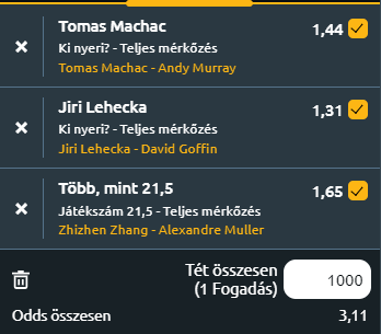 - Tegnap nem kezdődött jól. Az egyik meccs elmaradt, majd a másikban este egyetlen game kellett volna az overhez, hogy legalább valami kicsi jöjjön. De nem sikerült. Így megyünk tovább a második fordulóra. A tét még mindig 1Egység, azaz 1800 ft.