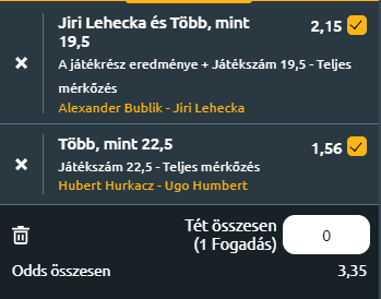 - Hurkacz a bikaszervát adó erőjátékosok egyik legjobbika. Humbert pedig a komplex teniszt nyújtó, gyors és technikailag ügyes teniszező, aki remekül fogad és képes kezelni ezeket a nagy adogatásokat. De minél gyorsabb egy felület, annál nagyobb esélye van a szervagépeknek nyerni. Ketten ők találkoztak Marseille-ben, csakhogy az egy fedett torna volt és az a borítás sokkal lassabb volt ennél a szabadtéri kemény dubaji talajnál! Ezen a talajon Hurkának sokkal nagyobb az esélye, de Humbert meg fogja szorongatni. Három szettet várok. Eredetileg a Hurkacz nyer + 19,5-et választottam volna, de mivel elég volt az over 22,5 is, maradtam annál. Remélem okos döntés volt.