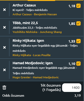 - A. Cazaux a fiatal francia generáció egyik jeles képviselője. 21 éves még csak, de már 3 CH-tornagyőzelme, a harmadikat idén, itt Ausztráliában érte el, amikor megnyerte a Noumea keménypályás CH-t. Utána berobbant az AO főtábláján, sorban megverte Djere Lacit, Runét, majd Griekspoort is! Hubert Hurkacz verte meg a legjobb 16 között úgy, hogy az első két szettben a srác képes volt a világ egyik legnagyobb adogatójának a szerváját kezelni. Azóta Montpellierben verte Marterert, majd kiesett Auger-Aliassime ellen. Dubajba feljutott a főtáblára a selejtezőből, majd az első körben megverte Musettit és a másodikban kapott ki Rublevtől. Nagyon jó kis gyors, technikás és mentálisan is erős játékos. Van benne jövő. Ellenfele Bennjamin Hassan egy libanoni játékos, még CH-szintnek sem nevezném és idén a kemény pályás mérlege 3GY-6V. Egyértelmű Cazaux-sikert várok, hatalmas meglepetés lenne, ha elmenne.