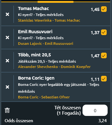 - Ofner magasabb, fizikailag valamivel erősebb, de Coric játéka sokkal komplexebb és benne is bőven van ütőerő. Jól szervál, alapvonalról rendkívül agresszívan teniszezik. A játékban, tehetségben jobb sokkal, mint Ofner. Viszont felemás az eddigi szezonja. Jól kezdett Döntőzött egy fedett CH-n, Franciaországban, majd a Montpellier-i tornán egészen a döntőig jutott, ahol Bublik megverte, itt Runét is megverte. Aztán viszont Rotterdamban és Dubai-ban is elsőkörös vereséget szenvedett. Ha Coric hozza a formáját, akkor nyerni fog. Ha nem lesz motivált, akkor baj is lehet. Csak a szettjét vállaltam erre a szelvényre.