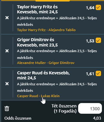 - Legutóbb a Shechenko meccs feladás miatt félbeszakadt, megnéztem a TIppmixpro eredménylistájában hálistennek 1.0-val számolták el az overt. A de Minaur meccs pedig jött.
