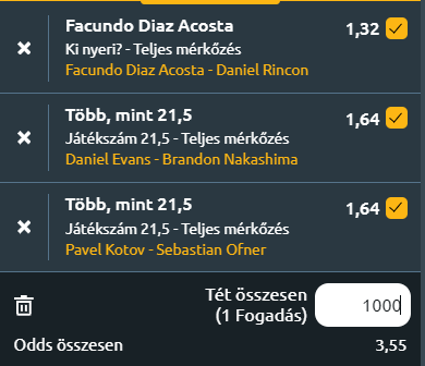 - Egyik játékosnak sem a salak a fő vadászterülete, sőt. Inkább a keményen érzik jól magukat. Mindkettő harcos, jól fogad és kitartó, elsősorban védekező stílusban. Evans nagyon gyenge formában van, de tavaly ugyanitt az elődöntőig menetelt, ezért egyrészt igyekeznie kell, másrészt motivált is lesz. Nakashima 11 évvel fiatalabb, nagyon tehetséges jó kis örökmozgó védekező játékos, de van benne ütőerő is! Volt egy remek éve 2022-ben, aztán visszaesett, ami a fiatal játékosoknál előfordul. Most jobban kezdett, keményen és fedettben 22-8-ra áll idén, döntők, elődöntők szegélyezték az idei állomásait és nyert egy challengert is keményen. Nálam ez overes meccs és kicsit Nakashima felé billen a mérleg. Over 21,5 game