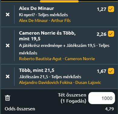 Bautista Agut-Norrie: Mind ketten brusztolós, jól mozgó játékosok, de a spanyol már öregszik. Norrie tenyeres pörgetésével szerintem gyakran ki fogja tudni nyitni a pályát, van annyira jó játékos hogy ezt meg tudja oldani. Indokolatlanul magasnak érzem Norrie oddsát, noha nem túl sikeres időszakon van túl. Monfils, Medvedev, Khachanov...ettől a névsortól nem szégyen kikapni, Braziliában pedig betegséggel küszködött. Ha nem is simán, egy hosszabb meccsen is fel tudja őrölni a spanyolt ahogy az a fenti tippben is áll. Norrie győz 1.69