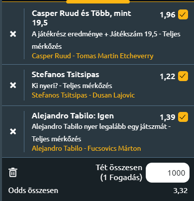 - Ruudről sajnos egyre inkább megerősödik az a tény, hogy komoly tét-, komoly győzelmi elvárás alatt nem tud úgy teljesíteni, ahogy kellene. Még soha nem nyert ATP500 vagy fölötti tornát, mert a döntőkben rendre elbukott! Pedig kiváló képességekkel bír és most nagyon jó formában van. De mi volt legutóbb is? Djokovicot remek játékkal verte meg, utána simán kikapott! Most ez még csak elődöntő, talán ezt még lehozza Etcheverry ellen, de az argentin erőteljes játéka alapján nem lesz sima. Ruud nyer + over 19,5 game