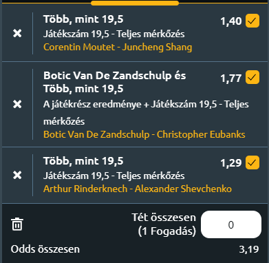 - Moutet egy technikás, tehetséges játékos, jó formában van a kvaliban remekelt két sima meccsen jutott fel a főtáblára. Shang elsősorban kemény pályán jobb, de a stílusa és mentális ereje abszolút alkalmassá teszi őt a salakra is, de még szoknia kell. Nagyon fiatal Shang, de az egyik legjobban fejlődő játékos. Mindkettő kiválóan fogad és tud támadni is, úgyhogy ezt én overes meccsre várom. Több mint 19,5 – 1,40
