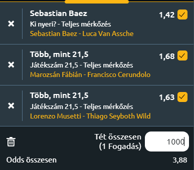 - Baez az egyik legkiválóbb salakos játékos a Touron! A gyors, technikás védekezésben extra jó játékosok egyike, aki mentálisan is erős! 24 éves, 6 ATP tornát nyert, abból 5 salakos. Ő az, aki esélyes lehet akár a tornagyőzelemre is most. Van Assche egy tehetséges fiatal játékos, univerzális, de még nem tart ott, ahol Baez, különösen salakon nem. Az argentin győzelmét várom.