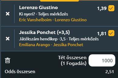 - Saint-Malo, női egyes challenger torna, salakon. Ponchet 27 éves, rutinos francia játékos, Arango 22 esztendős kolumnbiai teniszező. Ponchet jó formában van, legutóbb azt a Blinkovát verte meg, aki 34. is volt már a világranglistán és két WTA-tornagyőzelme is van! A kolumbiai ellen is hasonlóképp játszhat, lassítja a játékot, türelmesen, kitartóan teniszezik majd. Kiegyenlített meccset várok, amely szoros. Lesz. Kicsi hendivel lehet nyeretni a franciát.