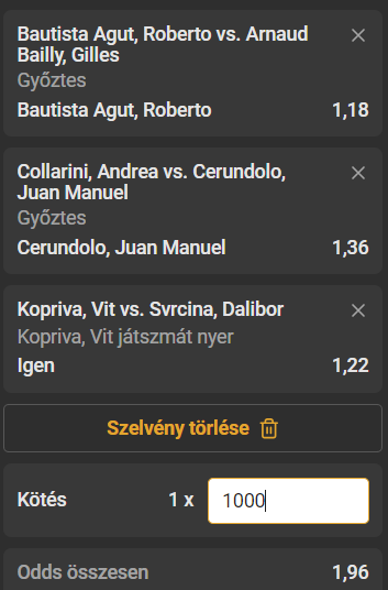 Részemről maradok még az ATP-nél, kicsit tesztelem az elképzelésemet, hogy változtatni kell az eddigieken. Mai nap én szettekre megyek, ezen belül Sonego - Jarry meccs, picit soknak érzem Jarryn az oddsot, de ha így akkor így, Zverev ellen is képes volt egy szettre, jó formában van, remélem komolyan veszi és hajtani fog. A másik kinézett meccs Arnaldi-Wolf összecsapás, bő 1 hete játszottak akkor sima 2-0 lett Arnaldinak, így az oddsokat értem, nekem most elég egy szett is tőle. :) Illetve, hogy közelítsünk a 2-es oddshoz, így Miro javaslatából kiszedem Bautista győzelmét, ránézésre is ezt akkor nem nyeri meg, ha nem akarja. :)