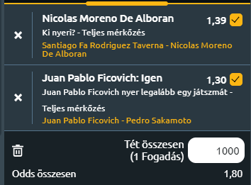 - Rodriguez Taverna (244.) - Moreno De Alboran (155.): Tegnapelőtt írtam Moreno De Alboranról: Moreno, akinek a legjobbja 121. helyezés volt a világranglistán kifejezetten szereti a kemény borításokat. Idén 39 meccset játszott szabadtéren, ebből 24-et megnyert. Két CH-tornagyőzelme van, ebből az egyik pont ilyen szabadtéri keményen, azt idén nyerte, de ezen kívül döntős szereplése is van. A US Openen a három kvalifikációs meccset sikerrel vette, a főtáblán Sonego megverte. Összefoglalva, Moreno egy alsó-középkategóriás, vagy attól valamivel följebb álló teniszező, aki szabadtéri keményen jól szerepel és idén jó eredményei vannak. Akkor Pucinelli de Almeidával játszott, aki echte salakos. Ma Rodriguez Tavernával találkozik, aki szintén elsősorban salakmenő és jóval hátrébb van a világranglistán is. Ma is nyerhet Alboran jó eséllyel! 1,39