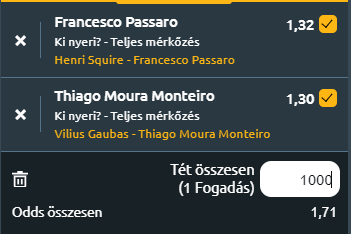 - Hát lehet, hogy pénzfeldobással kellene választani ezeken a CH-kon. Mindenesetre én most kihagyom a fogadást. Ami az osztrák tornáról elsőre feltűnt két meccs, azt ideteszem, mondjatok róla véleményt. Passaro esetén a tehetség és a közelmúltbéli jó forma, Monteiro esetén a rutin és a minőségi különbség miatt-, és mindkét esetben a salakos irányultság miatt érzem ezt. Holnap kezdődik két 250-es kínai torna, de komoly pénzdíjakkal, azokra koncentárlunk majd.