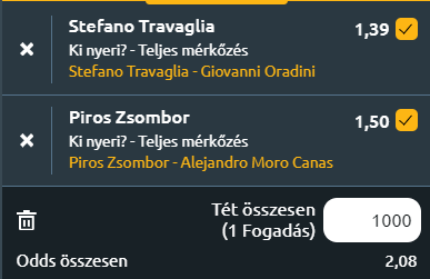 - Travaglia rutinos, erős középszint és kifejezetten salakspecialista. 5 salakos CH-t nyert, de már egy ideje nem jut el a trófeákig. 32 éves, ez az időszak nála is már a pénzkeresetről szól, meg arról, hogy élvezi a teniszt. Az ellenfele egy 26 éves "senki". Egyetlen ITF-tornát nyert eddig, soha nem volt TOP350-ben sem! Csak megveri már Travaglia a rutinjával és a tudásával!
