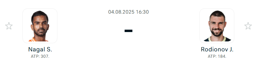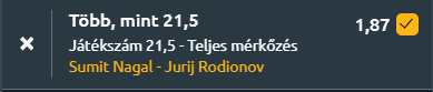 - A várható egymás elleni párharc kiegyenlítettnek tűnik. Nagal salakos tapasztalata és mozgékonysága kiegyensúlyozhatja Rodionov fizikai fölényét és szervabiztonságát. Éppen ezért vállalható tipp az, hogy több mint 21,5 játék lesz a mérkőzésen. A lassú borítás, Nagal kitartó stílusa és Rodionov szerva fölénye mind azt sugallják, hogy hosszú szettek várhatóak.