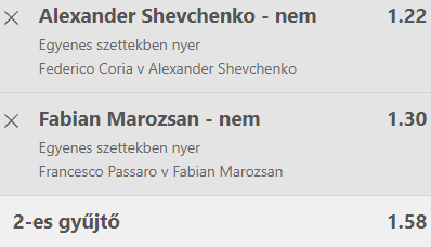 A szelvényen Coria és Passaro minimum egy nyert szettje. Úgy kell megfogadni, hogy a másik játékost kikeressük a lehetősége közül és az „egyenes szettekben nyer” opciónál a NEM-et választjuk a 365 napos irodánál! Erős esély 1,58-ért.