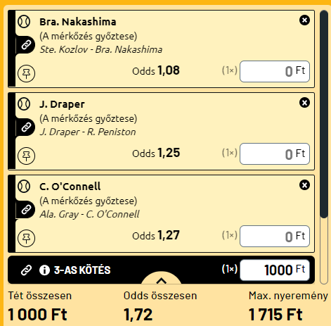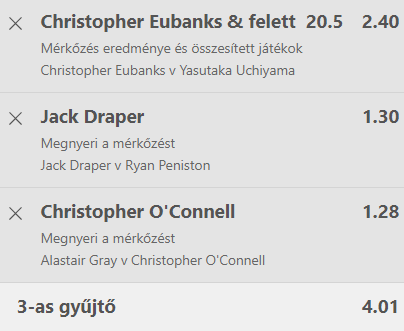 Ez a szelvényem kockázatosabb. Aki a biztosra megy Jack Drapert, Nakashimát és Chirs O’Connellt rakja 1,71-ért, ez erős tipp, de én kiveszem az 1,10-es Nakashimát és mellérakom Uchiyamáékat is és így lesz 4,01 természetesen szolidabb téttel!
