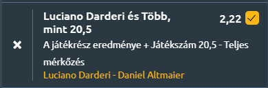 - Darderi nem csak technikásabb, tehetségesebb és gyorsabb is, hanem hazai pályán a közönség is őt segíti majd. Ennek ellenére Altmaier rutinja és ütőreje elég lesz arra, hogy ne agyonverje őt az olasz, akár még szettet is hozhat majd. Nyer Darderi, de lesz legalább 21 game.