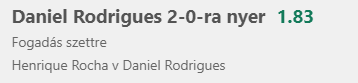 - A tornát kemény borításon rendezik! Daniel Rodrigues 2000-res születésű teniszező, eddig csak az ITF-tornákon mutatta meg magát, már most láthatóan a keménypályát kedveli. Tegnap nagyon magabiztos játékkal, két sima szettben verte az előzetesen esélyesebbnek tartott 24 éves brit Charles Broomot, aki a 417. helyen áll a ranglistán és idén 27 keménypályás meccsből 17-et nyert, nem csak rutinosabb, ahnem esélyesebb is volt mint a portugál. Rodrigues mai ellenfele az 1074-ik helyen áll a ranglistán, összesen 4 keménypályás meccset tolt és ebből kettőt bukott. Elsősorban salakon próbálkozik. Sem tehetségben, sem rutinban nem mérhető Broomhoz. Rodrigues sima kettőben fog ma nyerni ellene 1,83-ért. A 365 napos irodában lehet játszani!