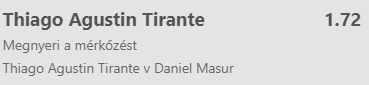 - Daniel Masur jóval rutinosabb. A német játékos már 27 éves, de sosem volt még a 176. helynél jobb pozícióban. Elmondhatjuk róla, hogy egy megélhetési teniszező, bár neki is van két CH-tornagyőzelme fedett keményről és van egy német bajnoki címe, szintén fedett keményről. Univerzális játékos, de neki a kemény pálya megy jobban. Itt a 21 éves olasz Belluccit verte meg, de csak három szettben. Tirante klasszisokkal jobb, raádásul ő salakon erős.