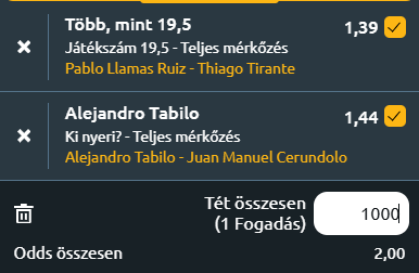 - Mivel ez a torna kemény borításon zajlott, ezért Tabilót tartom esélyesebbnek. Erőteljesebb, komoly ütőerővel bíró játékos, akinek két ATP tornagyőzelme van, egy füvön és egy keményen! Természetesen salakon is nagyon jól játszik. Cerundolo inkább salakon a jobb. Ma az erő és az agresszivitás dönt majd. A chilei nyer!