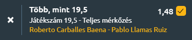 - A 32 éves spanyol játékos, Roberto Carballés Baena, salakon szerzett tapasztalatával és technikai tudásával kiemelkedik. Kifejezetten salakspecialista, remek pörgetett ütéssel. mentálisan erős, szívós és kitartó játékos, aki nem csak alapvonalról jó, hanem röptézni is jól tud! Pablo Llamas Ruiz, a 22 éves spanyol tehetség, szintén a salakpályás játékra specializálódott. Játékstílusa a spanyol iskola, az alapvonalról játszik, kitartóan és fegyelmezetten. Ezen kívül erős fizikummal és nagyszerű küzdőszellemmel rendelkezik, ami lehetővé teszi számára, hogy hosszú labdameneteket vívjon és nyomást gyakoroljon ellenfeleire. Bár tapasztalata még nem éri el Carballés Baena szintjét, a fiatal tehetség folyamatosan fejlődik és képes meglepetést okozni. A mérkőzés esélyese Roberto Carballés Baena, aki tapasztalatával és salakon szerzett tudásával előnyben van, de Llamas Ruiz fiatalos lendülete és küzdőszelleme figyelemre méltó, és nem lesz könnyű préda Carballes Baenának sem. Minimum 20 game várható!