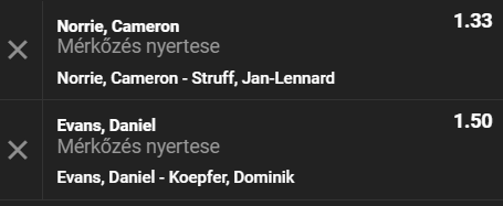 A brit- német ütközetben ma két fogadható mérkőzést játszanak. D. Evans (25.) - D. Koepfer (54.) ellen játszik, C. Norrie (12.) - J-L. Struff (51.) ellen vív meccset.