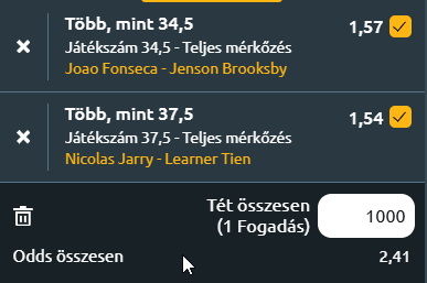 - N. Jarry – L. Tien: A chilei óriás hatalmas bravúrral verte Rune-t öt szettben. Szervája és tenyerese veszélyes, de a stabilitás hiányzik, lassú és technikai téren is csak erős közepes. Tien a legnagyobb tehetségek egyike! Ben Sheltont megverte Mallorcán! Jó formában van, de még tapasztalatlan. Jarry fizikailag fáradt lehet az előző meccs után. Ha Tien jól kezdi, akár meglepetést is okozhat. Tipp: Több mint 37,5 game – 1,59
