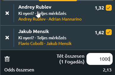 - F. Cobolli - J. Mensik: Mensik a jövő egyik legnagyobb ígérete! Erős, technikás, és fiatal kora ellenére már most nagyon stabil mentálisan is. Cobolli védekező játékos inkább, füvön ő nem tudja megfogni azokat a játékosokat, akik nem csak erősek, jól adogatnak, van ütőerejük és még technikásak is. Itt Mensik esélyesebb!