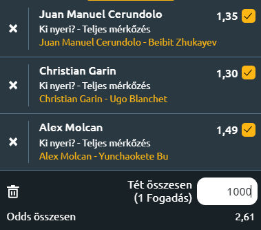 - J.M. Cerundolo - B. Zhukayev: A fiatalabb Cerundolo talán még tehetségesebb, mint Francisco. Már nagyon fiatalon 19 évesen megyerte élete első ATP tornagyőzelmét, természetesen salakon, illletve 7 CH-tornát is megnyert mát. Kifejezetten salakspecialista, egy súlyos tavalyi sérülés miatt van ennyire lecsúszva a ranglistán és hát neki sem a legideálisabban megy a visszakapaszkodás. Nagyon tehetséges, remélem sikerül neki visszajutni oda, ahová a tehetsége alapján való. A 23 éves kazah versenyző más szint, eddig életében egy CH-tornát nyert, azt is kemény borításon. Salakon itt ma Cerundolónak nyernie kellene!