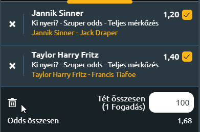 - J. Sinner – J. Draper: Drapernek nagy szerencséje volt eddig, ugyanis olyan játékosok szegélyezték útját az elődöntőig, akik nem voltak képesek kezelni egyetlen komoly fegyverét, a szervát! Ennek köszönhetően a brit szettveszteség nélkül jutott el idáig! Csakhogy most egy olyan ellenfél áll vele szemben, aki alapvonalról sokkal jobb, kiválóan fogad, simán visszaküldi majd a bivalyerős Draper-szervákat és minden másban jobb. Itt bizony ma véget ér a brit menetelése, ami így is nagyon szép eredmény! Tipp: Sinner nyer és kevesebb mint 37,5 game jó lehet! Egy szelvénybe pedig a Sinner nyer opció 1,20-ért tökéletes.