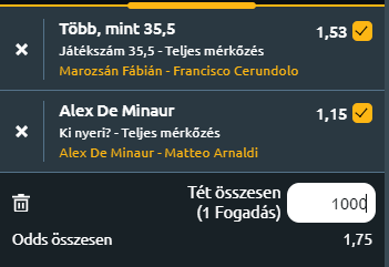 - Ez a mai poszt elsősorban Marozsán Fábiáné! A másik meccset csak azért kerestem hozzá, hogy egy megfelelő szorzó jöjjön ki. Alex De Minaur győzelme a fiatal Matteo Arnaldi ellen, úgymond megagiga-kötelező feladat! Ha a villámlábú ausztrál kiesik a második körben az számára több, mint szégyen lenne.