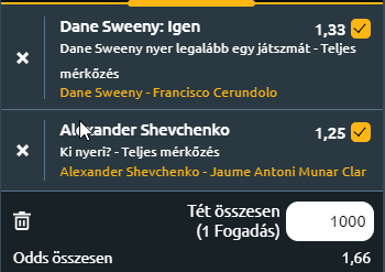 - Lehet, hogy nagyot kockáztattam ezzel a tippel, de az érvek és a tények amellett szólnak, hogy nagyon is van realitása. Dane Sweeney egy tehetséges ausztrál fiatalember, aki elsősorban a kemény borításokon érzi jól magát. Nem nyert még CH-tornát sem, viszont ahogyan az ausztrálok többsége, ő is rendkívül motivált, ha hazai tornáról van szó. Gyors, védekező játékot játszik alapvonalról, de van ütőerő is benne, még ha nem akkora, mint a mai ellenfelében. A kvalifikációból került a főtáblára, ahol két olasz tehetséget Luca Nardit és Matteo Gigantét verte meg, majd az utolsó fordulóban Zizou Bergst is elpáholta! Ez nagy meglepetés volt. Ami az ő előnye ma az, hogy meccsben van, rendkívül motivált és hazai közönség előtt játszik. Nyilván a nagy esélyese a meccsnek Francisco Cerundolo! Az argentin játékos a 22. helyen áll a világranglistán, abszolút univerzális. A tenyerese a legjobb ötben van szerintem az ATP Touron, bár biztos vitatkoznának velem sokan. De maradjunk annyiban, hogy kiválóan üti az alapütéseket. Salakon kezdte pályafutását, majd berobban keménypályákon, sőt füvön is eredményes! Nagyon rossz formában kezdte az évet. A tavalyi Paris Masters óta nem nyert meccset, kikapott Bautistától, Ale Müllertől és Dominik Thiemtől is, mindhárom alkalommal sima két szettben. Egyelőre úgy fest, neki a formaidőzítés nem jött meg, bár lehet, hogy ránk cáfol. Mindenesetre az ő kemény alapütéseit kiválóan tudja kezelni majd a gyors, védekező stílust képviselő Sweeney. Nem azt mondom, hogy itt az ausztrál srác nyer, de egy szettet simán elkaphat! Jutalomjáték ez neki, az élete legnagyobb lehetősége, reális esélye van egy szettgyőzelemre ma.
