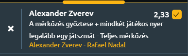 - Zverev nyer + mindketten nyernek egy szettet – 2,33 (Van rá esély, minden esélyeket latolgató oldalon azt olvastam, hogy Nadal egy szettre mindenképp jó lehet)