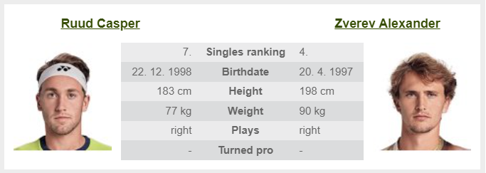 - Zverev három szettben nyerte meg a negyeddöntőt Alex De Minaur ellen, ez azt jelenti, hogy az előző két szoros és hosszú meccse után, tegnap végre többet pihenhetett. Ezen a téren Casper Ruud hatalmas előnnyel érkezik, hiszen nem játszott! A norvég brusztolós, agresszív alapvonalas játéka ellen eddig nem volt ellenszere senkinek. Zverev számára nagyon fontos lesz, mennyire ülnek majd az első szervái, ez lehet a fő fegyver, ez által a saját adogatásait eséllyel tudja hozni. A lehető legagresszívebben, legbátrabban kell játszania a németnek ma és végig nyomás alatt kell tartania a norvégot, aki mentálisan nagyon erős, nemigen szokott meginogni meccsek között. Tavaly már találkoztak ugyanitt, akkor Ruud viszonylag simán nyert, de Zverev akkor tért vissza súlyos sérüléséből, a német akkori játéka messze nem volt olyan ütőképes, mint most. Fizikálisan is sokkal erősebb, kondicionálisan tökéletes. Jó kis meccs várható, amiben a legvalószínűbb az, hogy nem lesz sima. Nem vállalkozom a kimenetel megtippelésére, a game-ek számában hiszek.