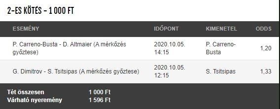 Mára egy kétmeccses szelvényt választottam, ez tűnik a legbiztosabb választásnak. Az egyik meccsen Pablo-Carreno Busta (18.) az egyik meglepetésemberrel Daniel Altmaierrel (186.) találkozik, a másik összecsapás a babyFerderer Grigor Dimitrov (18.) és a TOP 6. Stefanos Tsitsipas találkoznak. Két jó meccs, lássuk, mi dönthet.