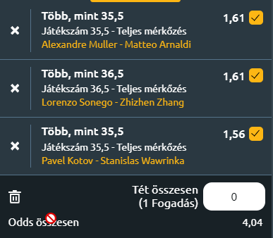 - Wawrinka 39 éves múlt! Lehet, hogy egykor ő volt a világ egyik (második) legjobb salakpályás játékosa, de most már csak a kicsit jobbak és fiatalabbak ellen már nem rúg, akarom mondani üt labdába! Az első körben a szintén veterán Andy Murray ellen nyert. Kotov 14 évvel fiatalabb, magas, remek ütőerő van benne. Cam Norrie ellen nyert jó játékkal az első körben. Wawrinka technikailag sokkal jobb, mint az orosz, de a 14 év és a fizikai-kondicionális hátrány sok lesz. Az első szettekben még jobb lehet, mint Kotov, de ha az orosz képes 80%-át hozni annak, amit tud, akkor meg fogja fordítani a meccset. Over 35,5 – 1,56