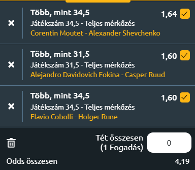 - Nyilván a dán az esélyesebb, de ehhez jó formát kell nyújtania, mert Cobolli igazi salakspecialista és egyre jobb formában van! Az első körben Medjedovicot verte meg, azelőtt szettet lopott Casper Ruudtől! Tehetséges játékos, mentálisan is jó és ami fontos, fejlődik! Rune TOP10, minden borításon nagyon erős, de fejben még nagyon sokat kell fejlődnie ahhoz, hogy konzisztens jó játéka legyen! Over 34,5 – 1,60