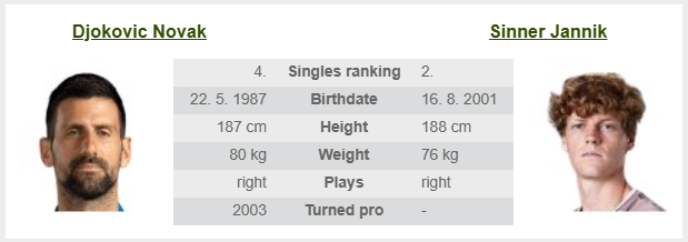 - Most már gyakorlatilag semmi esélye sincs DJokovicnak egy egészséges Sinner ellen, még salakon sem. Itt ezen a gyors kemény borításon, végképp nincs. A kérdés az, tud-e minimum 30 game-et összeütni az olasszal, vagy alatta marad. Szerintem most kipihenten (mindkét előző meccse hamarabb ért véget) és ismerve Djokovic mentális erejét, képes lehet rá, de figyelmeztető jel, hogy Musetti amíg nem volt sérült simán verte már Djokot! Sinner meg egy nukleáris Musetti! Szóval szerintem 30 game meglehet majd.