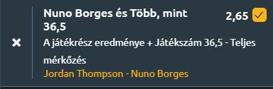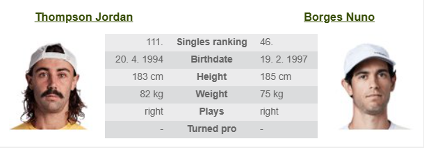 - Aktuális meccs elemzése: Két hasonló stílusú játékos találkozik ma, Borges valamivel fiatalabb, és technikai téren talán jobb, míg Thompson a hazai környezetet nagyon szereti, rendkívül motivált és harcos lesz! Mindkét játékos mentálisan nagyon erős, mindketten a hosszabb game-ekben érzik jól magukat. Összességében tehát kiegyenlített meccs várható, Borges győzelmi esélyei midnenképpen jobbak, de Thompson az utolsó percig fog küzdeni, harcolni és egy szettre minimum ő is mindenképpen jó lesz!