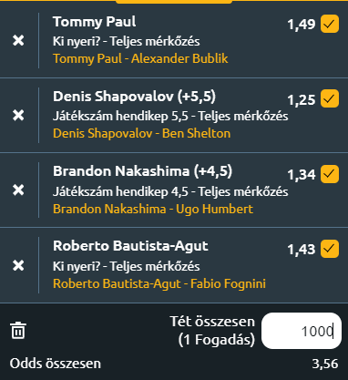 Tehát ha mai összes ATP meccsen 4+szett lesz akkor az már 26,73as eredő, vagy ha kivesszük Sinner meccsét akkor 11,14es