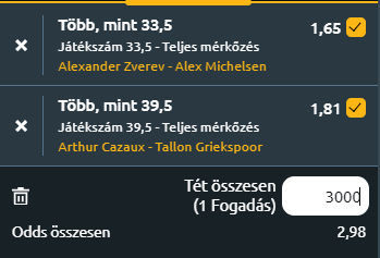 - Kis változtatásra volt szükség, mert már nincs olyan egyértelmű győzelmi-esély, amelynek a szorzója megfelelő lehetne. Ezért két overes meccset kerestem. Zverev klasszis játékos, minden borításon kiváló, a tavalyi sérülésből való visszakapaszkodás után már-már a régi önmagát idézi. De itt az AO-n mindkét eddigi meccsén veszített szettet! Michelsen pedig egyfelelől nagy tehetség és kifejezetten keménypályás menő lehet belőle. Másfelől azt a Leheckát verte meg az előző körben négy szettben, aki az AO előtt remek játékkal nyerte meg az adelaide-i tornát! Zverev mindkét eddigi ellenfelénél jobb Michelsen, így várhatóan számíthatunk minimum 34 game-re