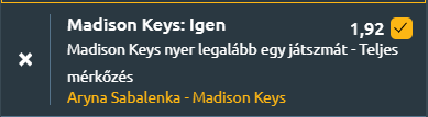 Keys nem az esélyesebb, de az elődöntőben is meghálálta a bizalmat és 1-0-ról tudod fordítani, úgy, hogy ajándékba kapta a második szettet, amit szépen ki is használt, 6-2-re hozta. Ma ekkora odds szerintem ajándék, abban nem vagyok biztos, hogy megnyeri a döntőt, de egy szettet el fog tudni lopni Sabelenkától.
