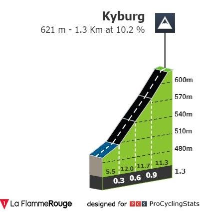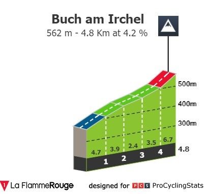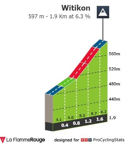 Emelkedők: Öt emelkedőt kell említeni, de magas hegytől mentes nap lesz, még a 800 métert sem érik el a csúcspontok. Két részre lehet bontani, a Buch am Irchel, Kyburg, Suessblatz a nap elején, majd a Zürichbegrstrasse (1,1 km hosszú út átlag 8%), Witikon duó a körözés közben hétszer. Beszéljenek a rajzok: