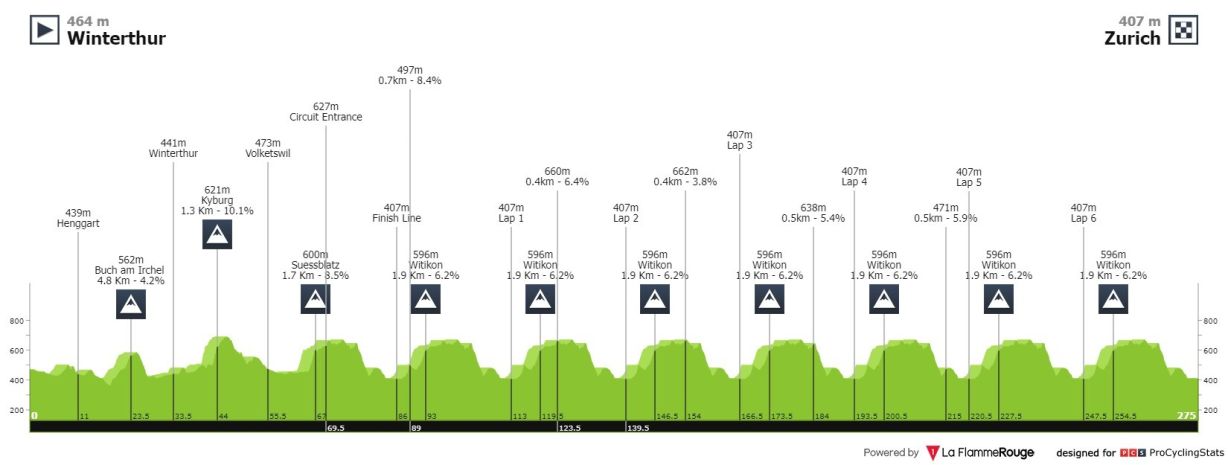 Útvonal: Winterthurból indulnak, három emelkedőn át jutnak el a kerékpározók a célvonalhoz Zürichbe (a Zürichi-tó partjához), de nem a verseny végéhez. 86 kilométer megtétele után kezdődik a körözés, hét teljes kör után ér véget a mai nap. Egy kör 27km távolságot jelent, Miből áll? Zürichbergstrasse és a Witikon a két fontos mászás, de ezek nem konkrét hegyek, hanem egy meredek út és egy dombos területen található városnegyed. 273,9 kilométer a teljes táv, 4500 méter szintkülönbség. A legnagyobb favoritok mellett, a puncheur típusú versenyzőknek is kedvez a terep, akik robbanékonyak és szeretik a rövid emelkedőket.