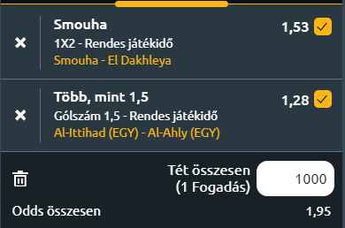 - Al-Ittihad – Al-Ahly: Két erős csapat a 6. helyen álló Al-Ittihad fogadja az 5. Al-Ahly-t. Az Al-Ahly sokkal jobb kerettel bír, mint ez az 5. hely, amit most tudnak, tőlük ez kudarc. Fognak ők még feljebb menni. De az Al-Ittihad is jó lesz otthon egy gólra. Minimum két gól várható.